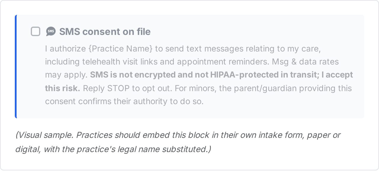"I authorize {Practice Name} to send me text messages relating to my care, including telehealth visit links, appointment reminders, and related communications. Standard message and data rates may apply. Message frequency varies based on my appointments. I understand SMS messages are not encrypted and are not protected by HIPAA in transit, and I accept this risk for the convenience of receiving care communications by text. I understand I can opt out at any time by replying STOP, or reply HELP for help. For minors, the parent or guardian providing this consent confirms their authority to do so."
