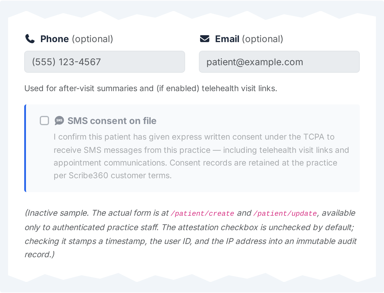 - Practice staff attests in Scribe360 by checking the SMS consent box on the patient record. The platform stamps timestamp + attesting user + IP into an immutable audit log.